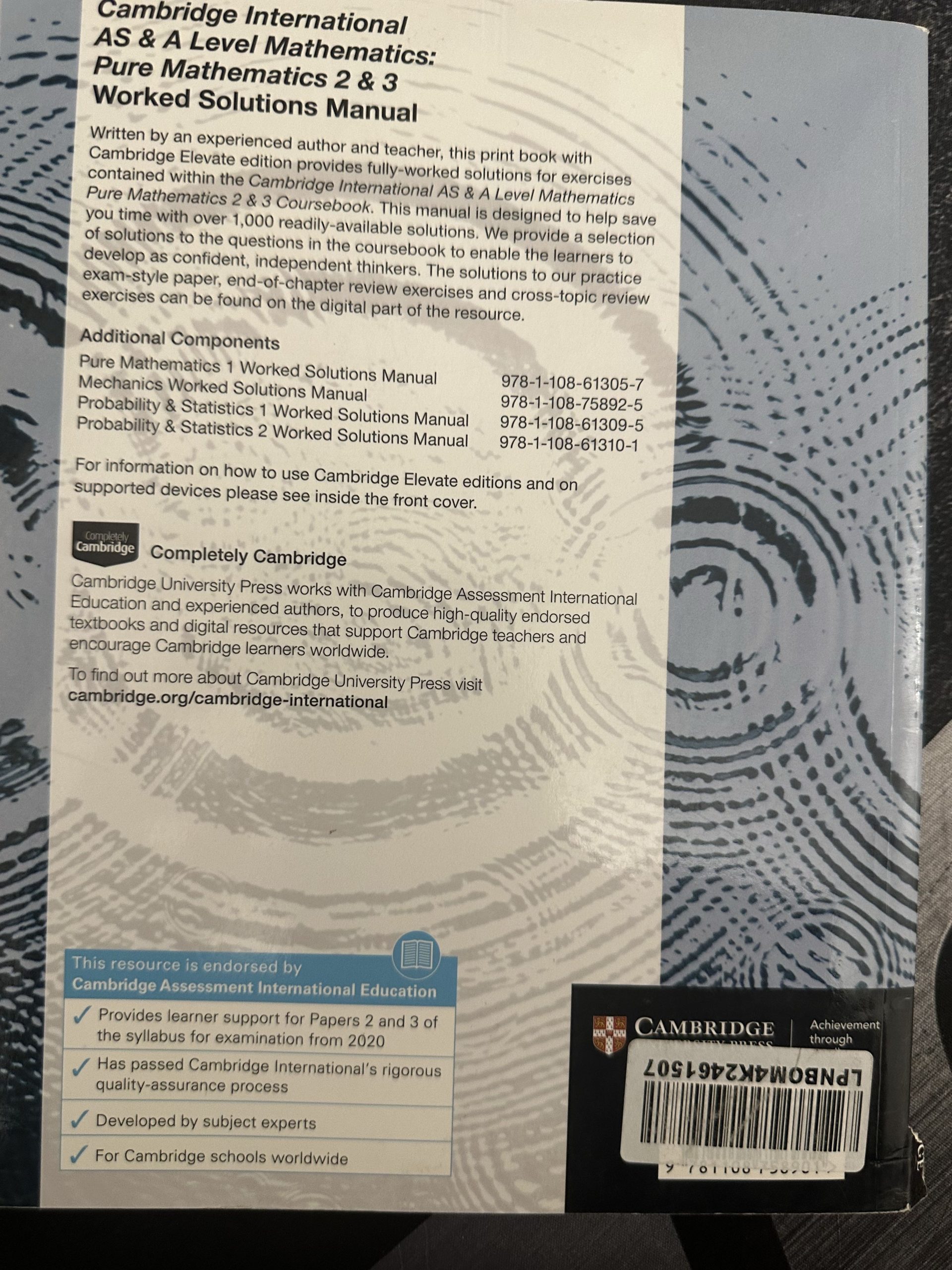 Written by an experienced author and teacher, this print book with Cambridge Elevate edition provides fully-worked solutions for exercises contained within the Cambridge International AS & A Level Mathematics Pure Mathematics 2 & 3 Coursebook. This manual is designed to help save you time with over 1,000 readily-available solutions. We provide a selection of solutions to the questions in the coursebook to enable the learners to develop as confident, independent thinkers. The solutions to our practice exam-style paper, end-of-chapter review exercises and cross-topic review exercises can be found on the digital part of the resource.